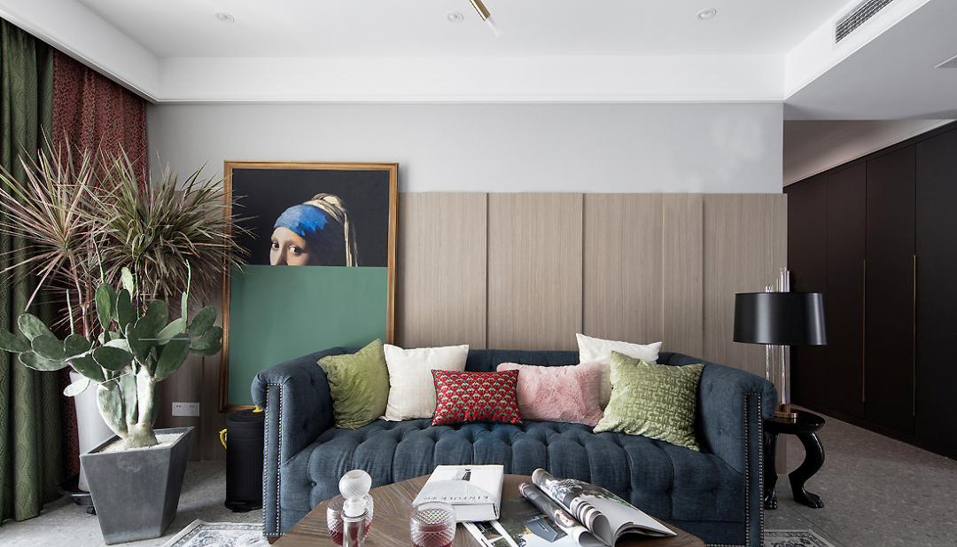 ▲ 深藍色美式沙發(fā)承載著浪漫與優(yōu)雅,色澤明快而又溫柔的抱枕隨意傾靠,帶來柔和清爽的視覺感。