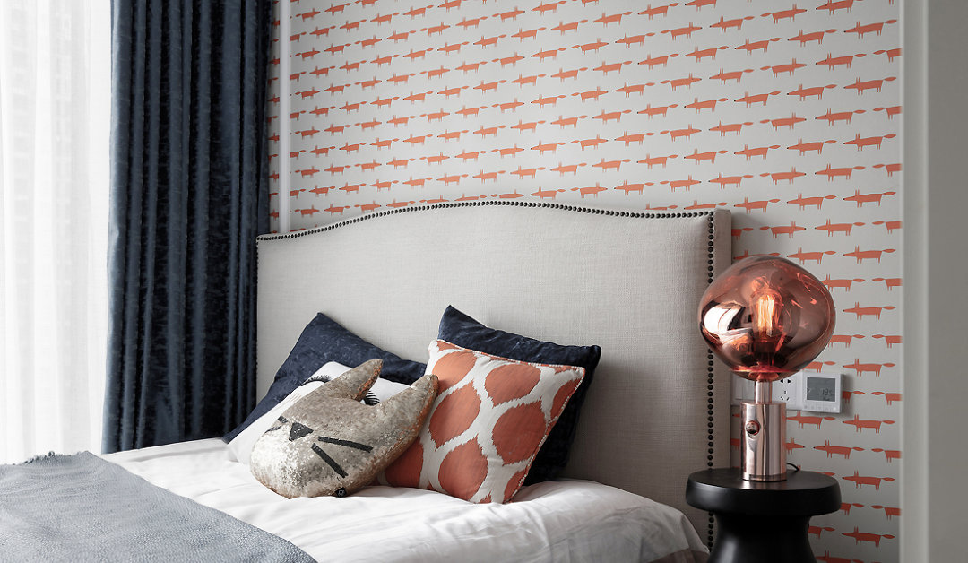 ▲ 主臥,綠植圖案的背景墻加以金色抱枕的點綴,與窗簾色調(diào)相呼應(yīng)。人字形地板鋪貼,在視覺上有拉伸空間的效果,增添優(yōu)雅高級的質(zhì)感。