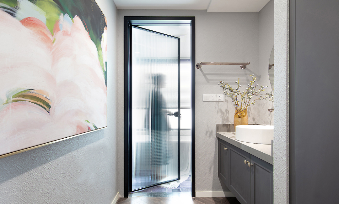 ▲ 衛(wèi)生間干濕分離,干區(qū)墻面以一幅氣質(zhì)掛畫裝點,柔和明麗,增添清新文藝的氣息。透光的玻璃門設(shè)計,不僅不會影響干區(qū)的采光,還帶來了朦朧的美感。