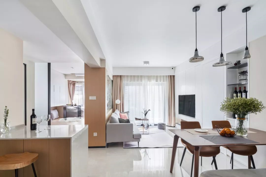 在入戶門的另一側(cè)做了一個(gè)小吧臺(tái),廚房門外的小吧臺(tái)能夠增添一些情調(diào)感,整體開(kāi)放式的布局也讓人感覺(jué)非常的寬敞和明亮。