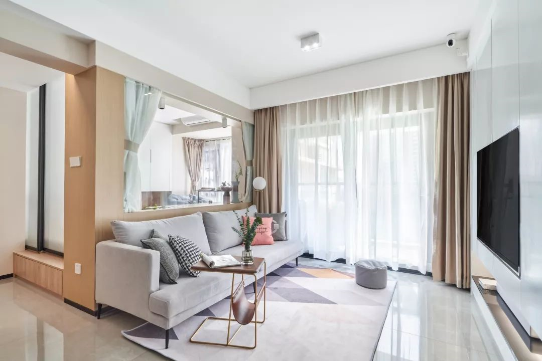 ▲灰色調(diào)的布藝沙發(fā)和彩色的幾何地毯,選擇用邊幾來(lái)代替茶幾,很有北歐風(fēng)的感覺(jué)??蛷d的后方是榻榻米次臥,用玻璃作為隔斷,看起來(lái)更為寬敞和明亮。
