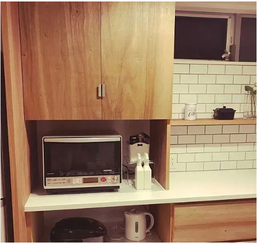 因此,我更建議在臺(tái)面和墻體的角落位置,做一個(gè)和臺(tái)面相接的柜子,把常用的電器收納于此。