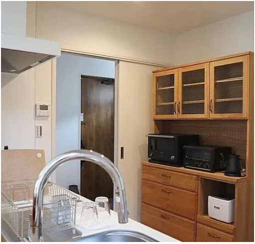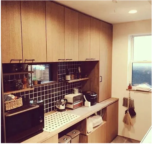 地柜留空這一設(shè)計(jì),在日本的很多戶型案例中都能看到。這里并不會(huì)選擇放置那些大件的電器,而多用來(lái)存放一些小型的電器。