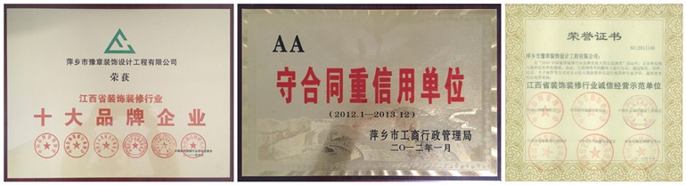 榮獲江西省裝飾行業(yè)“十大品牌企業(yè)”和“誠信經(jīng)營示范單位”榮獲萍鄉(xiāng)市“守合同重信用AA單位”,董事長榮獲第十四屆萍鄉(xiāng)市 “十大杰出青年”,設(shè)計(jì)總監(jiān)榮獲江西省“十大杰出設(shè)計(jì)師”等榮譽(yù)稱號。